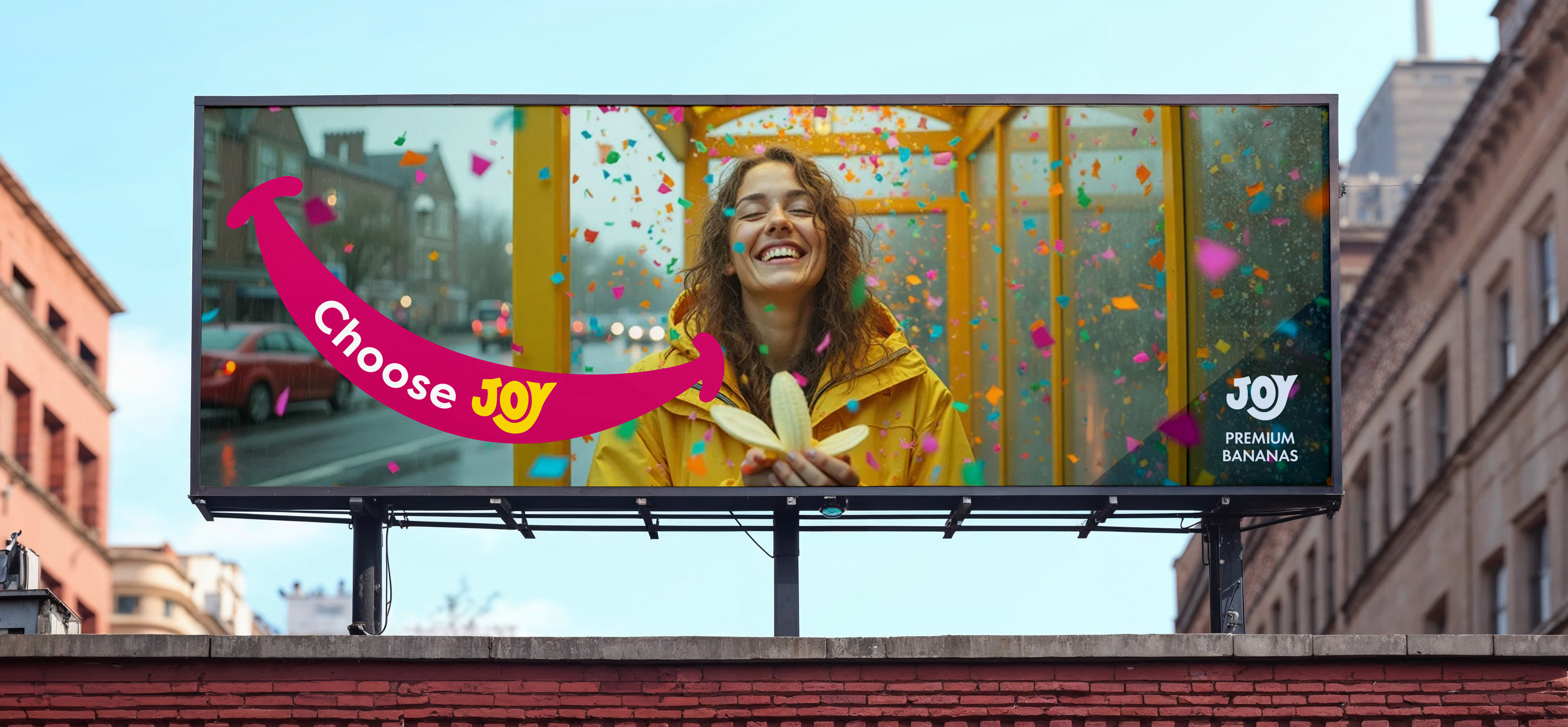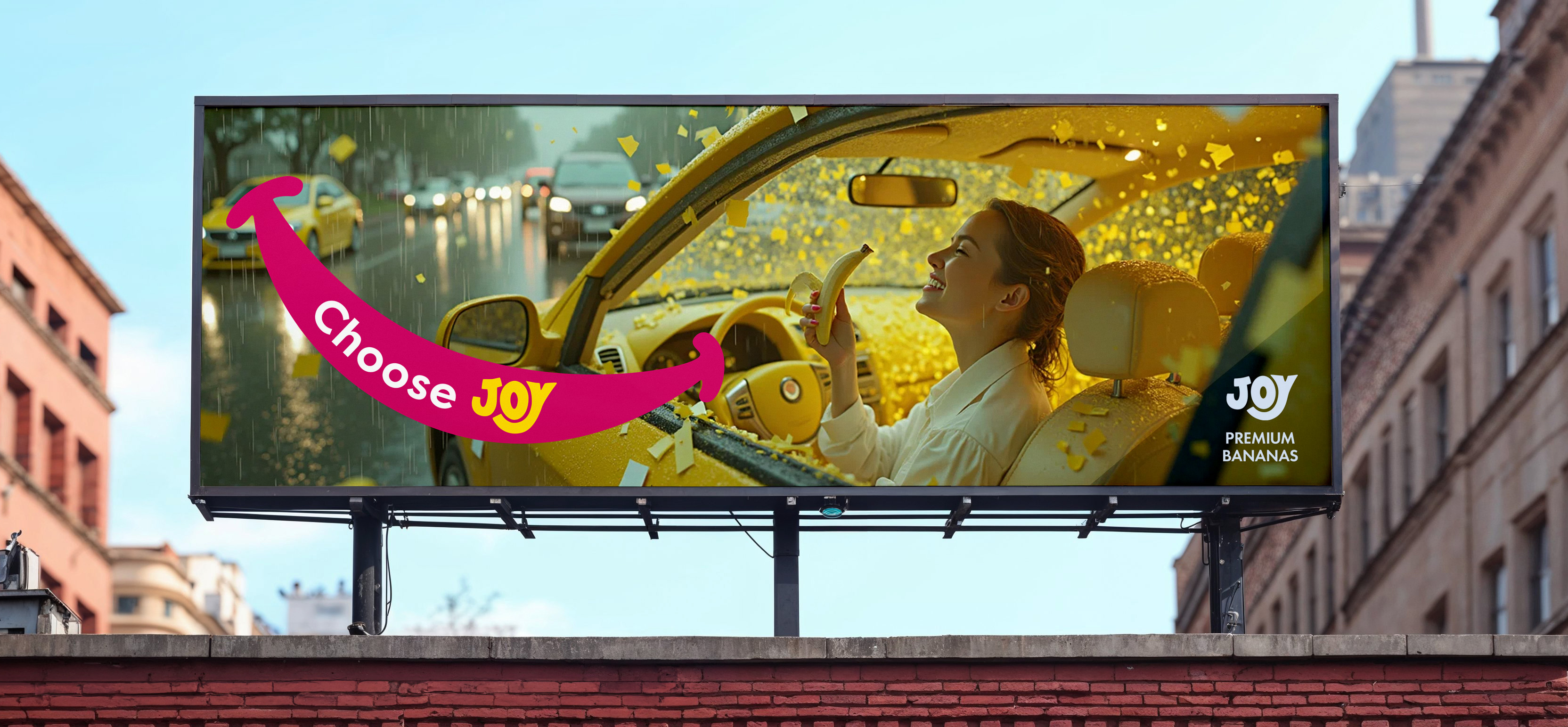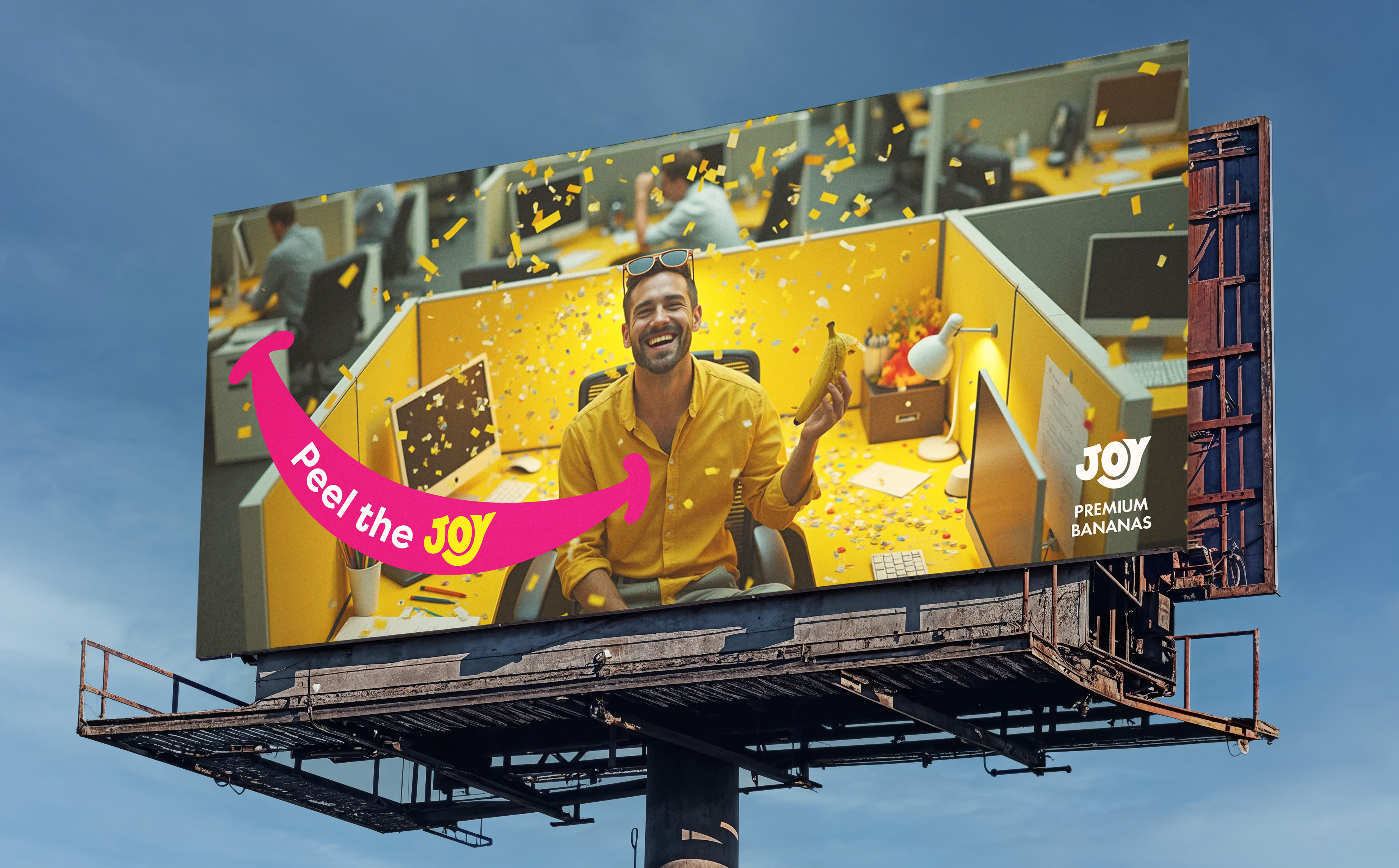 The campaign contrasts gray, monotonous scenes with vibrant bursts of yellow, turning the simple act of peeling a Joy banana into an instant emotional reset.