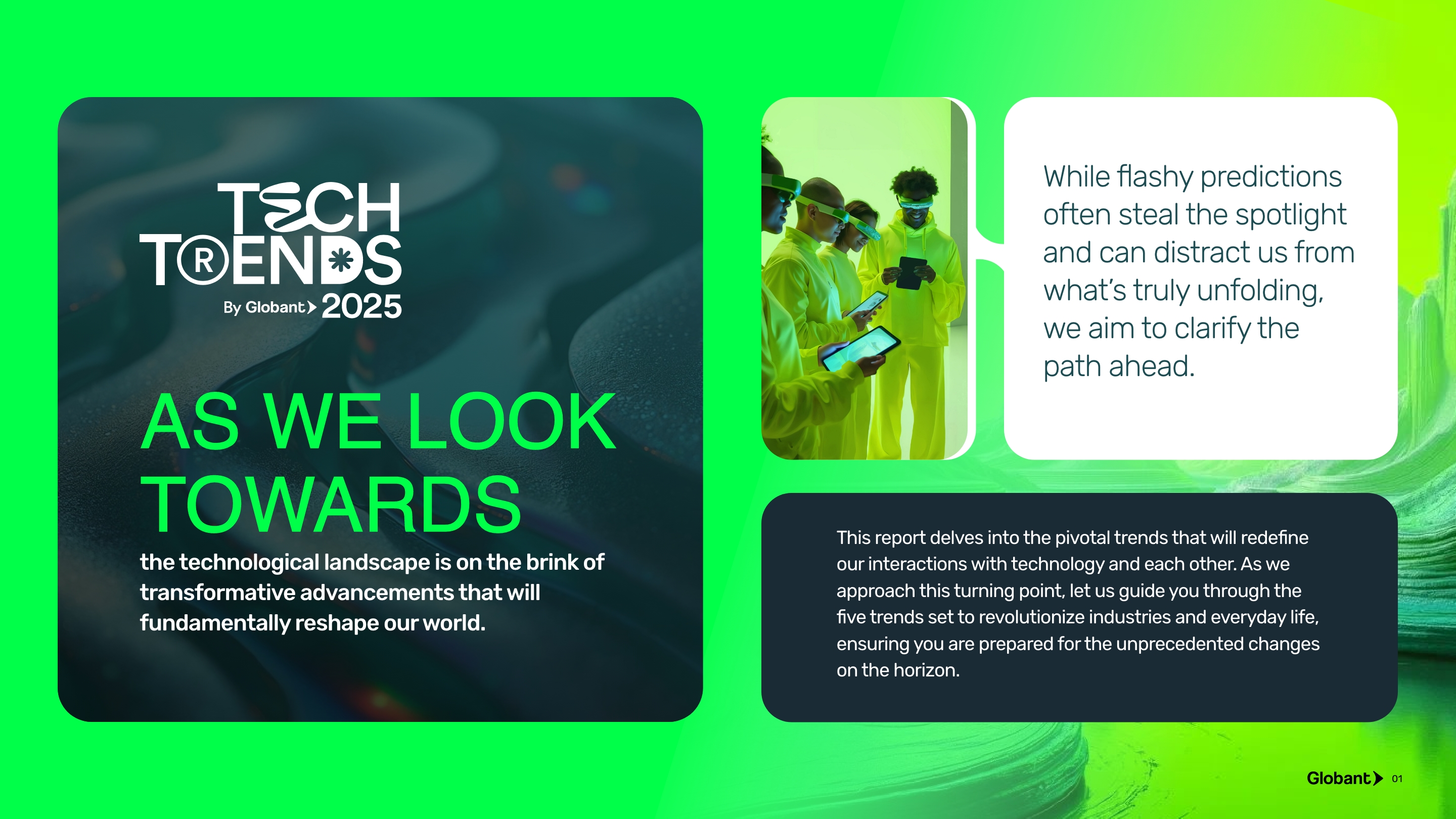 In today’s tech-driven world, where rapid change shapes both business and human experiences, our challenge was to spotlight key technology trends with a fresh, eye-catching design. As Globant’s most important annual report, it delivers critical insights aimed at boosting business efficiency, elevating customer satisfaction, and enriching employee experiences.
